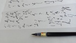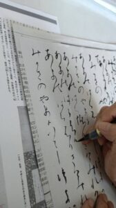 何回も手本を横に書くのですが万葉文字としてくずし字を理解する事が難しく、サラサラと書き上げる事はまだまだの事です。