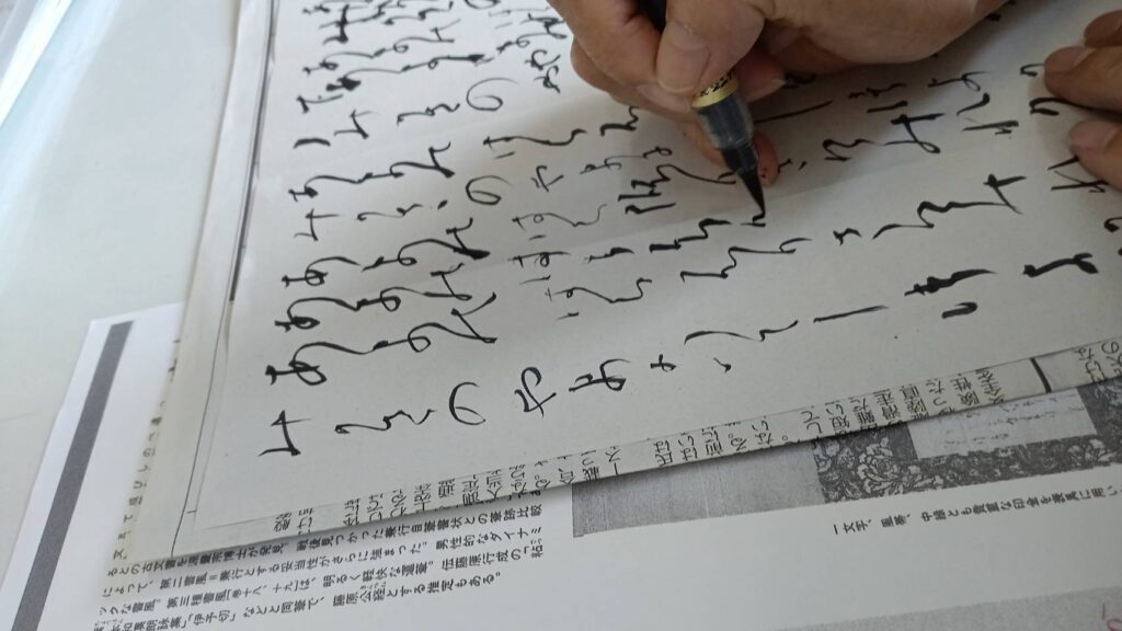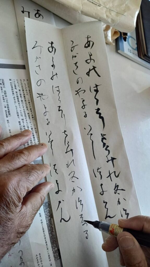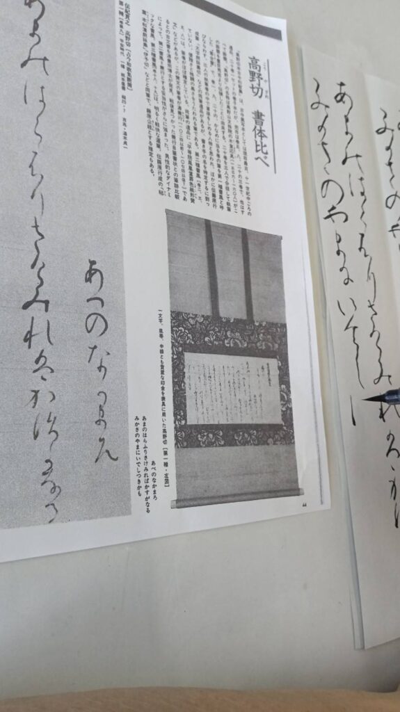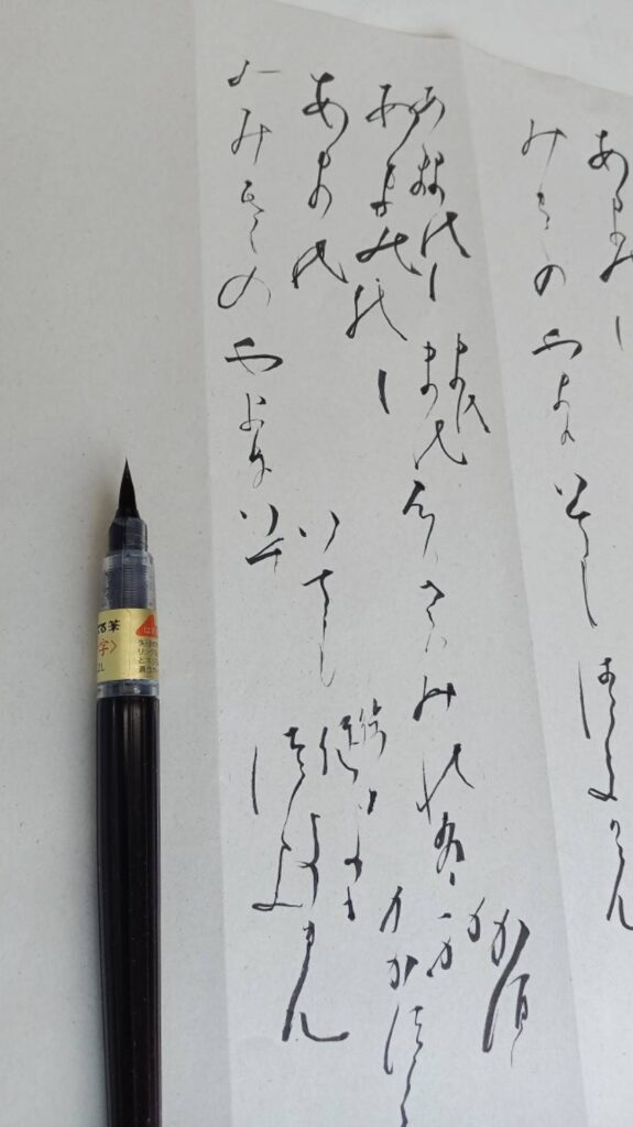 何回も手本を横に書くのですが万葉文字としてくずし字を理解する事が難しく、サラサラと書き上げる事はまだまだの事です。