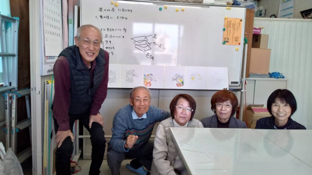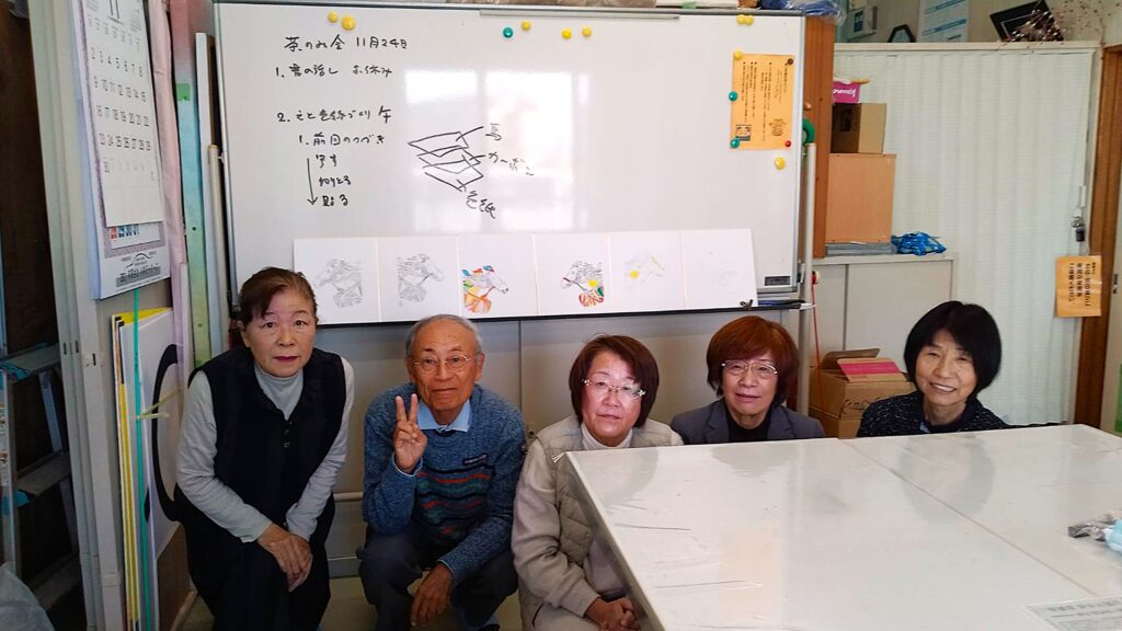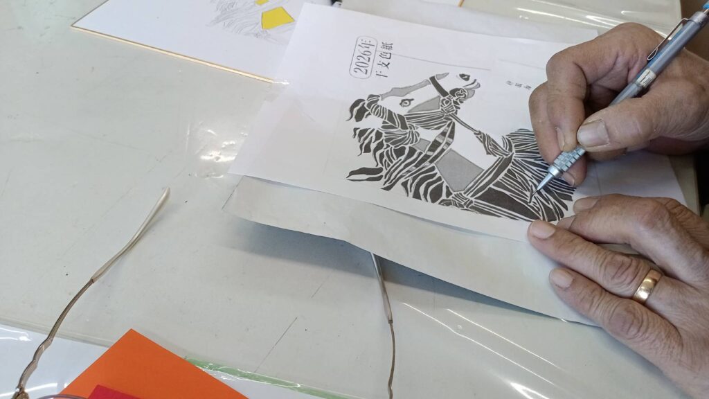 前回お休みの二人も揃い、色紙の上にカーボン紙を挟み、原紙を乗せ、午の貼り紙の準備です。