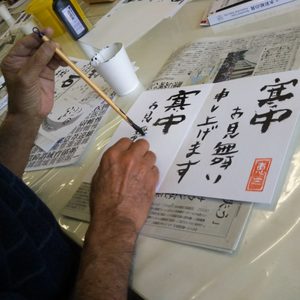 左手の2本指で大きな字、小さな字、又書き順を変える中、かすれ、にじみを出し「寒中見舞い」