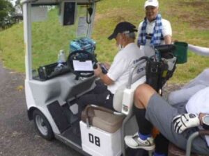 悪い予感通り、タフネス金田さんが体調不良でハーフでリタイア、重ねてインコース、トップ組のカートが10番後の急坂で突然停止、何となんとバッテリー切れ!!。
