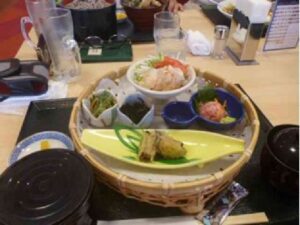 - ④昼食風景「品数豊富な籠盛り定食」