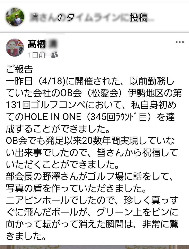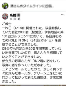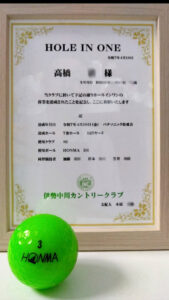高橋清さんが、7番ホール、約125ヤードで、見事、ホールインワンを達成されました。