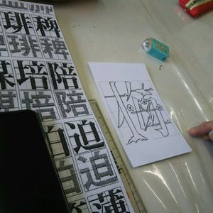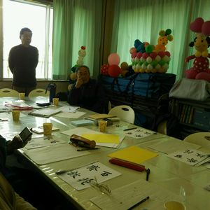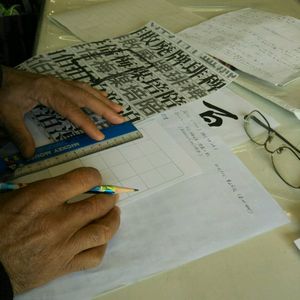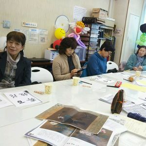 今日は絵画の歴史について古い絵画を見せて頂きながら教えて頂きました。絵の始まりは800年程前からで中国で古墳の壁画から始まっているのではないかとのことです。この頃の色彩は色石を砕き、接着材(にかわなど)で固めたそうです。これでこそ何百年も素晴らしい状態で残っているようです。今日の実技は「臨書」、書道の字を鉛筆で真似る。とのものですが字を一生懸命書き終わったと思えば、字の配置はどうでしょうとの事です。勿論字もです。絵文字は「梅」の字に挑戦しました。さて、仕上がりは? 皆、息注ぐまもなく書いている姿には感心!!