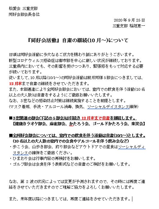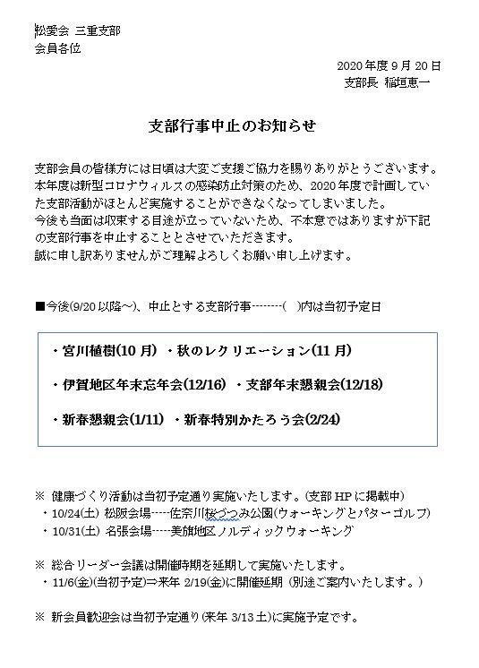 2020.09.20 三重支部 お知らせ, 同好会新着情報, 本部掲載, 行事検索連動 松愛会 三重支部行事&同好会 中止のお知らせ 投稿者: Msaru 三重支部 お知らせ, 同好会新着情報, 本部掲載, 行事検索連動 2020年度 三重支部 新会員・歓迎会前の記事 R2年 伊勢 健康ウォーク・パターゴルフ次の記事