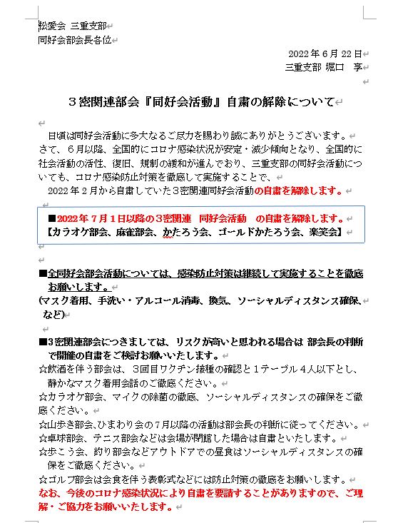 早速ですが、三重支部3密関連『同好会活動:健康カラオケ部会、麻雀部会、かたろう会、ゴールド語ろう、楽笑会』