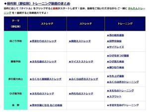 ・下図のような「部位別」の運動方法が、短い動画(YouTube)で、紹介されています!