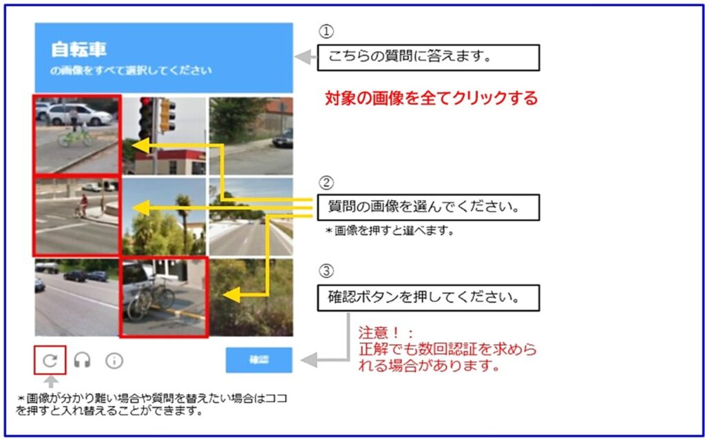 チェックを入れて、先に進めると、いくつかの画像が表示され、「信号機の画像を全てチェック!」などの確認が出ます。(ここで終われば正常)