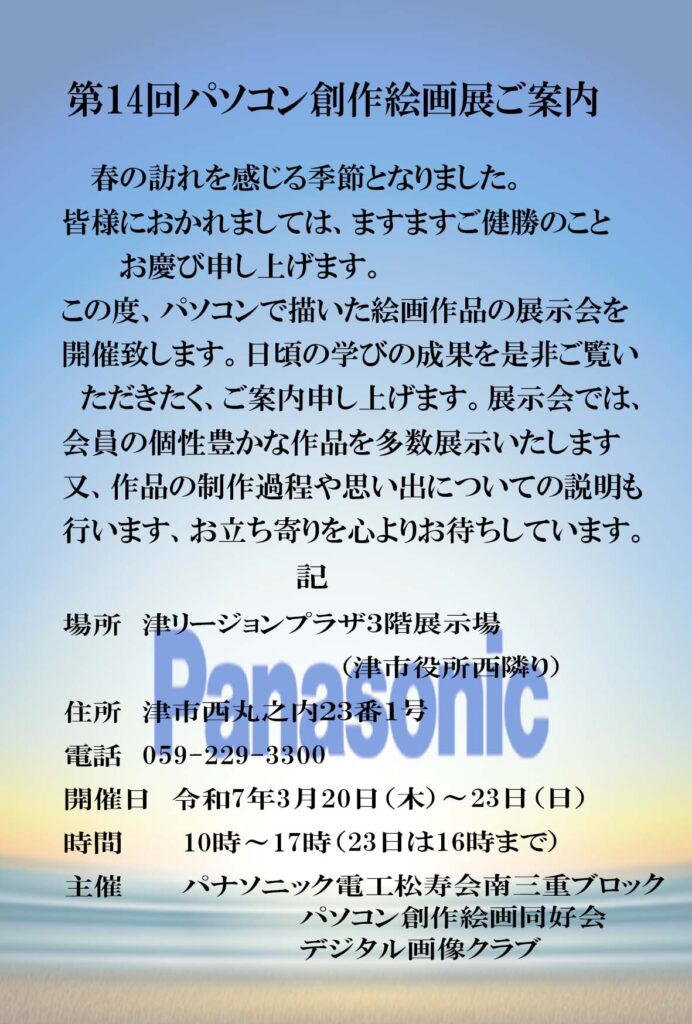 2025.02.13 三重支部 お知らせ, 支部&同好会開催案内, 本部掲載, 行事検索連動 松寿会 パソコン創作絵画展開催のご案内 ◆開催場所;津リージョンプラザ3階展示場(津市役所西隣り) ◆開催日;令和7年3月20日 (木)〜23日 (日) ◆開催時間;10時~17時(23日は16時まで) ◆主催;パナソニック電工松寿会南三重ブロック パソコン創作絵画同好会 デジタル画像クラブ 投稿者: Msaru 三重支部 お知らせ, 支部&同好会開催案内, 本部掲載, 行事検索連動 コメント: 0 松愛会 本部、よりのお知らせ前の記事 松阪第一 親睦 卓球大会(2月9日)参加 報告!次の記事
