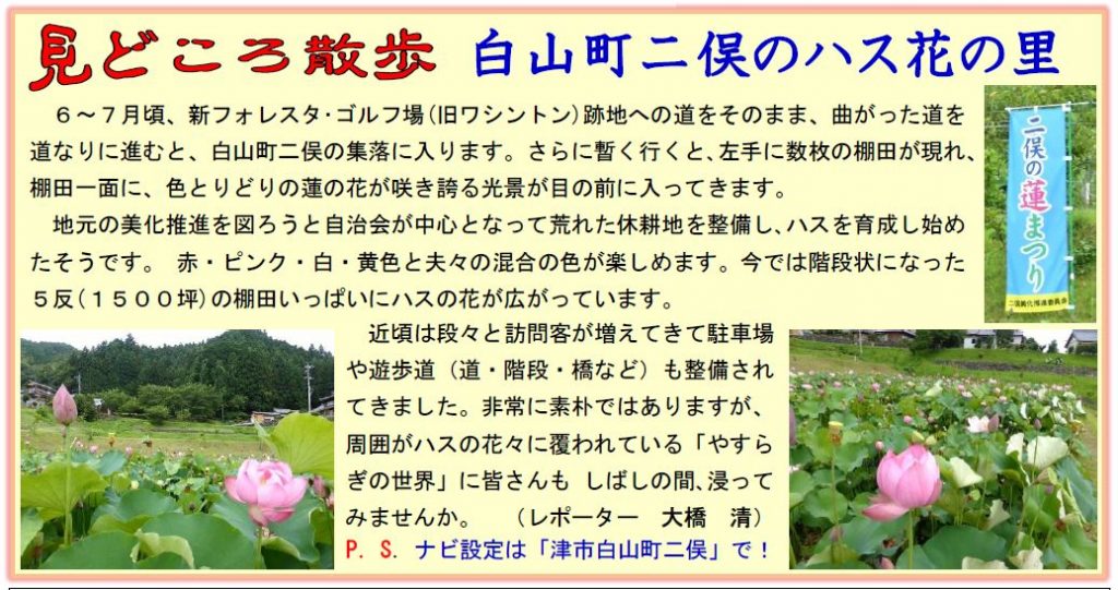 6月発行の「みえだより初夏号」「見どころ散策」白山町二俣の蓮池をご紹介していますが、