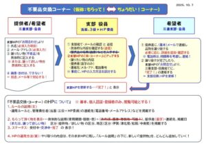 ※ 不要品の交換コーナーを通じて、お互いの助け合い、並びに会員同士のコミュニケーションの活性化・会員相互の繋がり・友愛の輪を広げることに結びつけば!と思っております。多くの方々の、参加を期待しております。