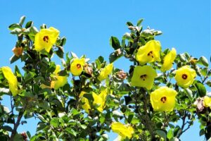 <写真>「見ていると元気の出る」地元の夏の花々:松名瀬海岸のハマボウ㊧、明和町・斎王の庭のタイタンビカス㊥・㊨