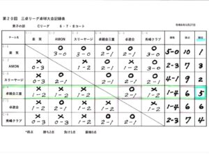 - 出場者:(男子の部:Cリーグ)倉本、大野、丸井、中嶋の4人(女子の部)中上さん(F会員)