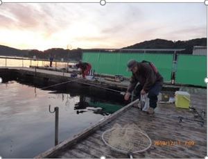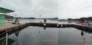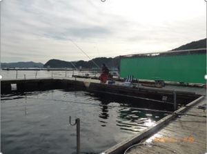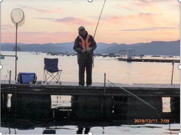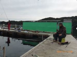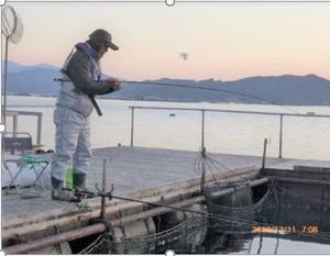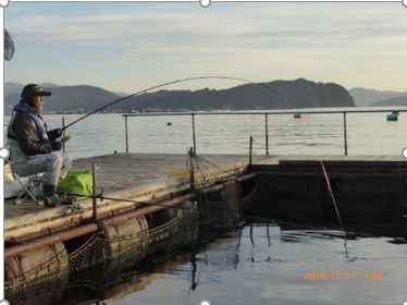6時過ぎ海上釣り堀に陣取り、大急ぎで竿を出しひたすら誘うも水温の低いせいかなかなかアタリが出ず。
