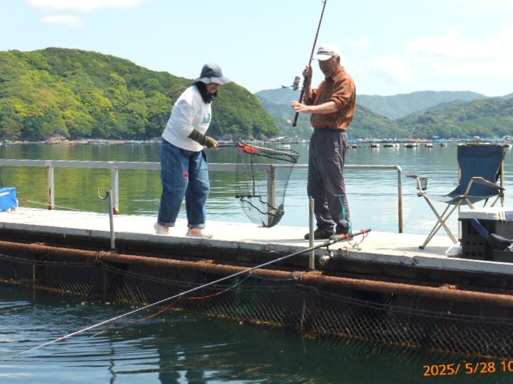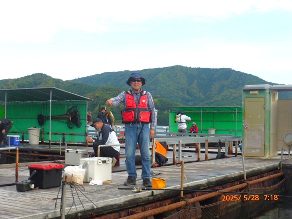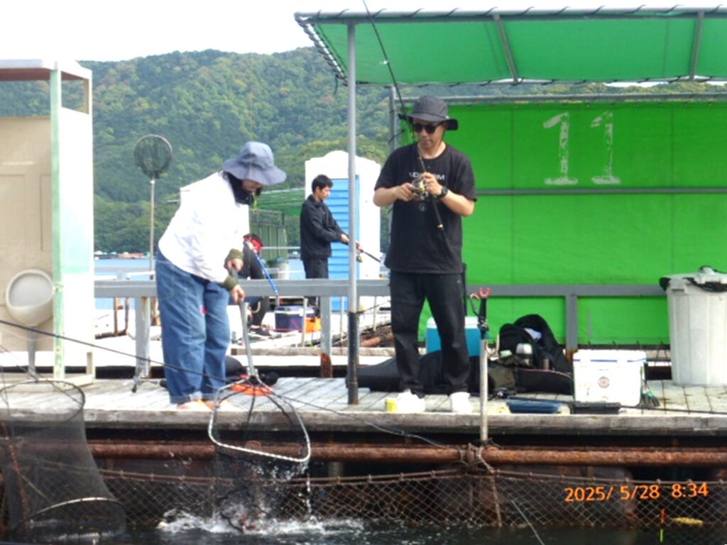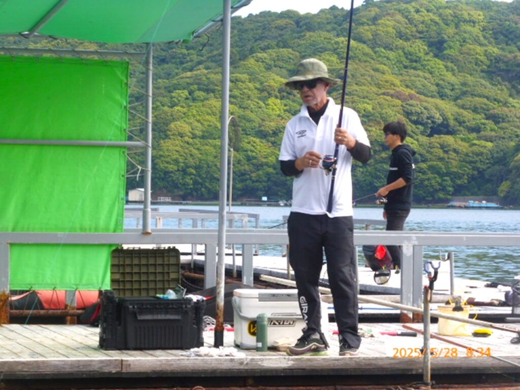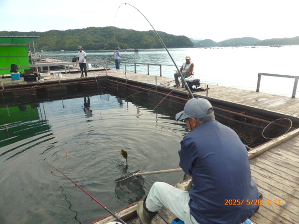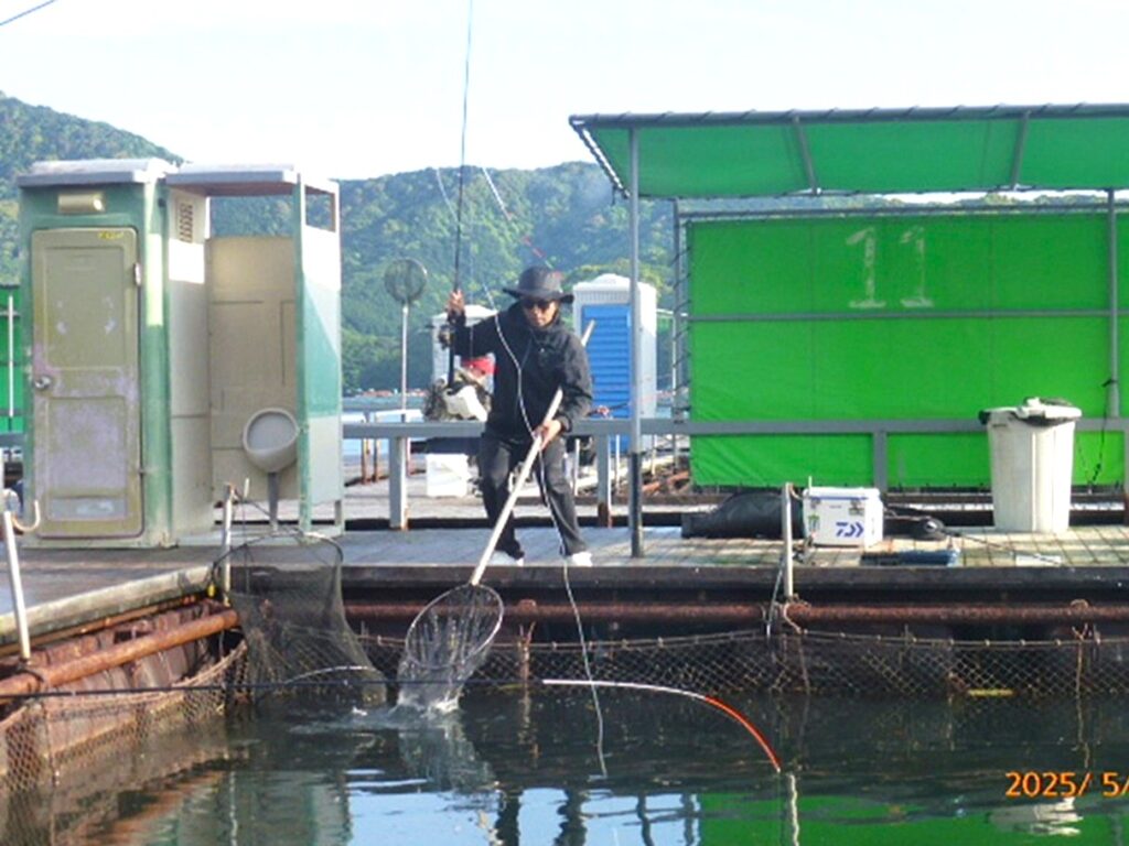 手が空くと、釣り堀の外海で、青物用餌の小サバをサビキでゲット。皆さんの応援に一役買っておられました。