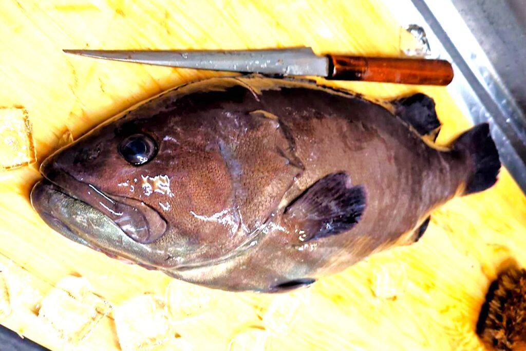 そうこうしていると、筆者にもアタリが。多少引くのが重いので、慎重に巻き上げるとなんと高級魚のクエ(写真⑦)。