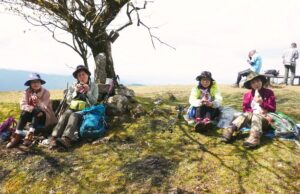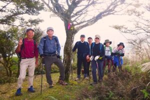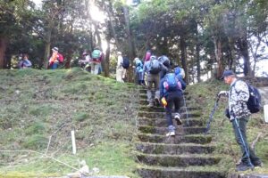 また、急な階段や滑り易い斜面を励まし合いながら、歯をくいしばって、何とか12時に山頂に到着しました。