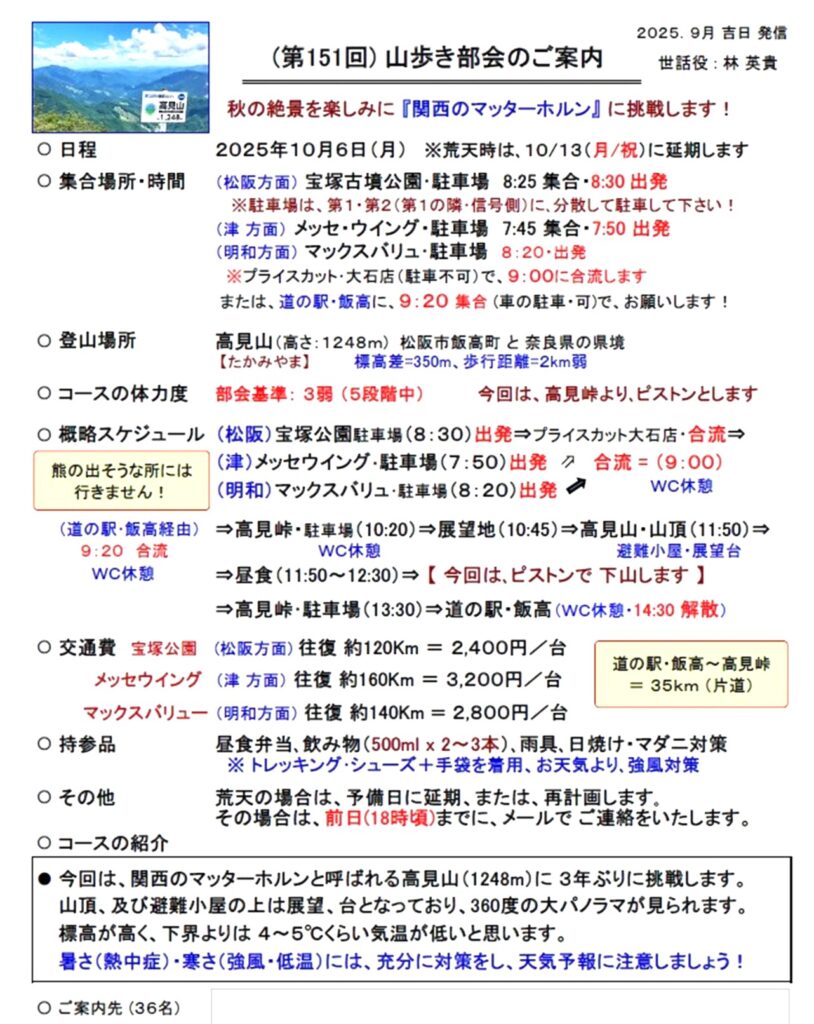 • 集合場所:津・メッセウイング 7:50出発、松阪・宝塚古墳公園 8:30出発明和(マックスバリュー) 8:20出発