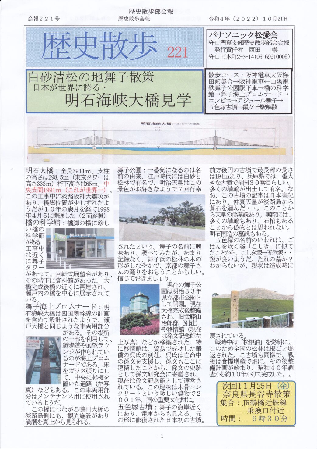 2022.10.23 最新情報, 歴史散歩部会 歴史散歩第221回日本が世界に誇る明石海峡大橋見学 橋 の 科 学 館 舞子海上プロムナード 明石海峡大橋と瀬戸内海を見ながら食事 松林を歩く 五 色 塚 古 墳 は~い きれいですね海が一望できますが向こうに見えるのはどこでしょうか ここは空気がきれいで景色がいいですよまたきたいですねと言っています 最新情報, 歴史散歩部会
