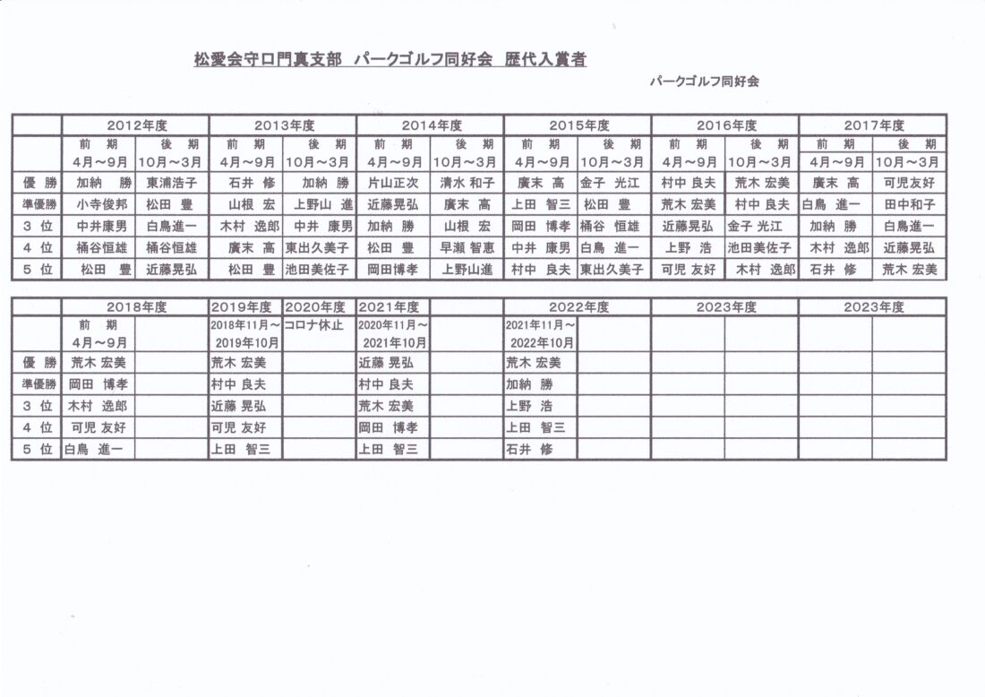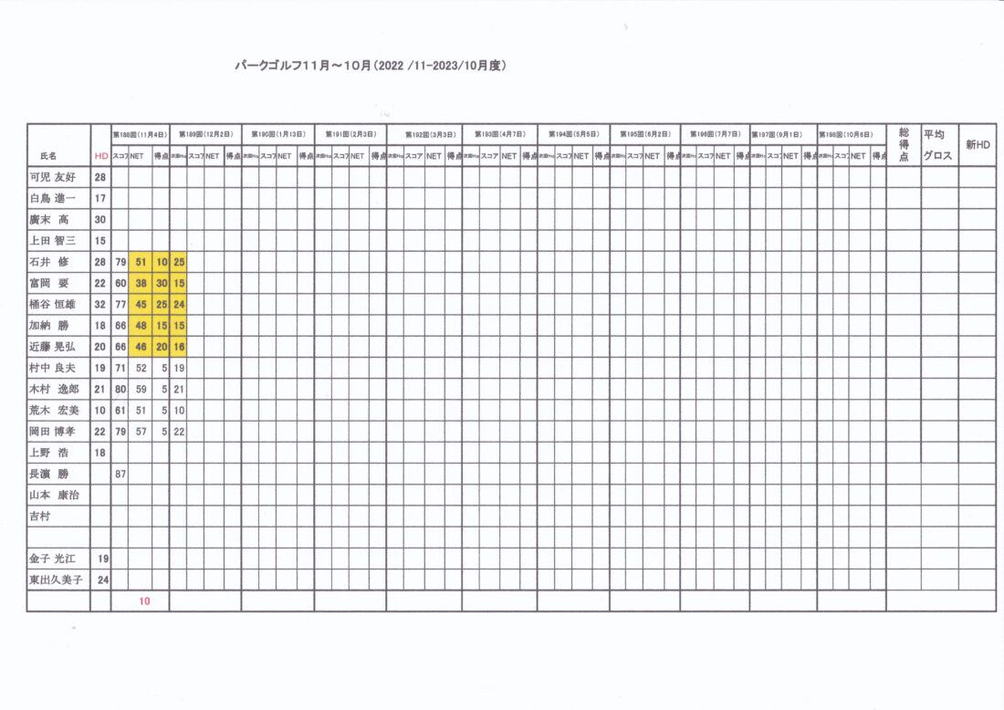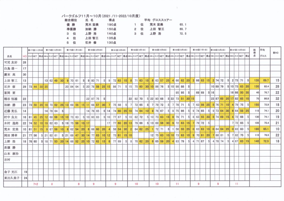 2022.11.6 パークゴルフ部会, 最新情報 パークゴルフ11月4日開催。2022年年間表彰しました。 11月4日(金)の成績表です。 優勝 荒木さん グロススコアー1位荒木さん 準優勝 加納さん 5位 石井さん パークゴルフ部会, 最新情報