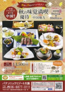 2023.09.27 いってきました, 最新情報 パナソニックリゾート大阪と秋の万博記念公園に行って来ました。 パナソニックリゾート大阪秋の味覚満載優待 秋の万博記念公園 パナソニックリゾート大阪の秋の味覚を頂きました。 お品書き 秋の味覚オードブル お造り 松茸の土瓶蒸し 黒毛和牛のステーキ 飲み物一覧表 穴子一本揚げ ばら寿司 デザート 万博記念公園に歩いて行きました。 コスモス、コキアフェスタ9月30日から10月29日まで開催。ちょっと早い秋見つけた。 花の丘に到着 コキア どこでもドア コスモス いってきました, 最新情報