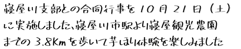 2023.10.24 支部行事, 最新情報, 本部掲載 ウォーキングと芋掘り大会を10月21日(土)に寝屋川支部合同行事で実施しました 寝屋観光農園まで歩きます 寝屋川市駅前に集合 ウォーキング開始 安全に 颯爽とウォーキング 打上川治水緑地で小休止 寝屋川団地横を通過 山側に曲がり 寝屋観光農園に到着 芋掘り大会 長濵守口門真支部長挨拶 北口寝屋川支部長挨拶 芋掘り開始 大収穫 長さ、太さ、重さ、形、コンテスト 審査中 むむっ 表彰です おめでとうございます あなたがチャンピョンです 寝屋川支部さん有難うございました 支部行事, 最新情報, 本部掲載