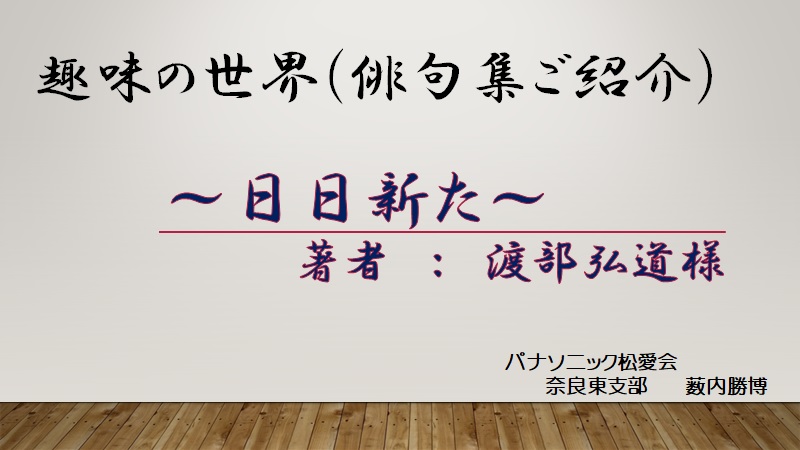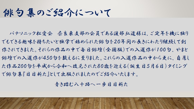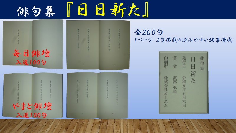 奈良東支部の会員である渡部弘道さんは、ご定年を機に独りでもできる趣味を持ちたいと独学で始められた俳句を20年間の長きにわたり、継続して創作されてきました。それらの作品の中で、毎日俳壇(全国版)での入選作100句、やまと俳壇での入選作100句を俳句集『日日新た』として出版されましたのでご紹介させていただきます。