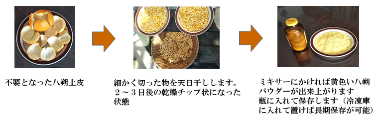 皮を細かく切って2~3日天日干します。乾燥したチップ状の皮をミキサーにかけます。内を見ながら綺麗な黄色のパウダーが出来上がれば完成。瓶に入れておけば長期保存ができます。