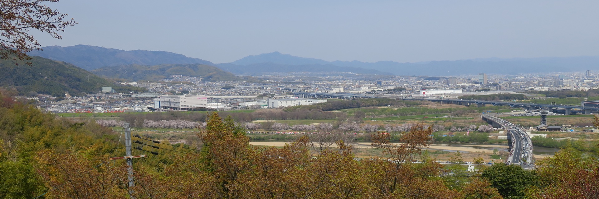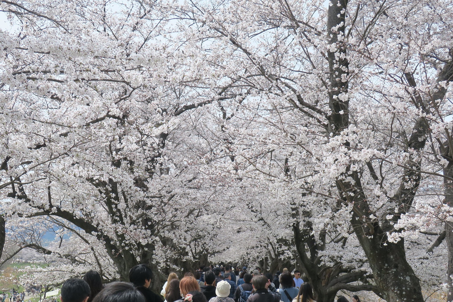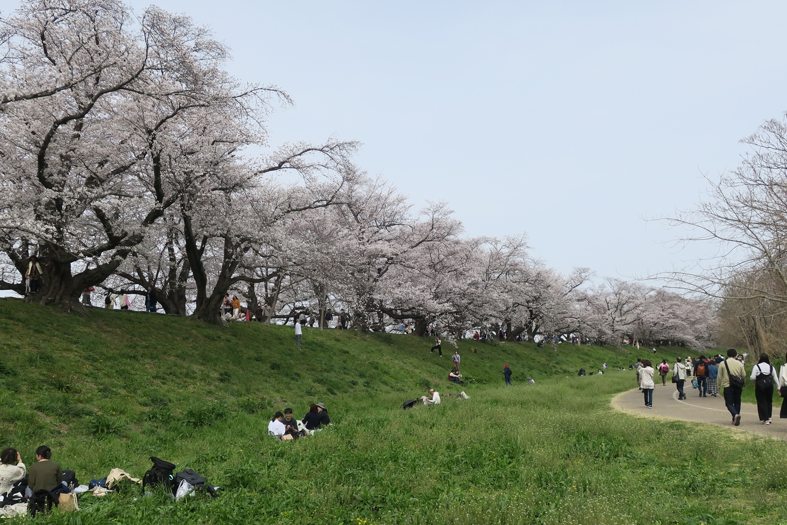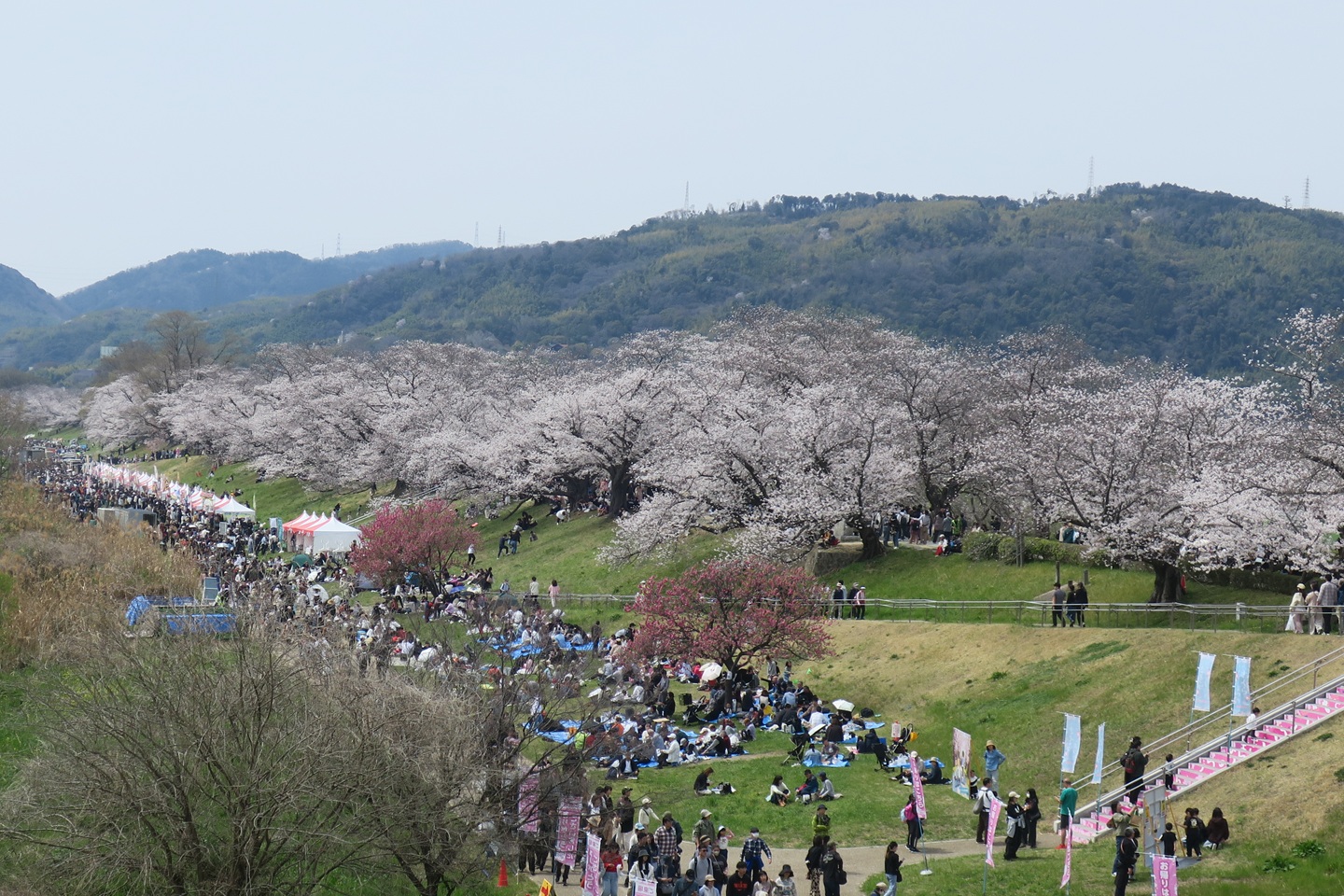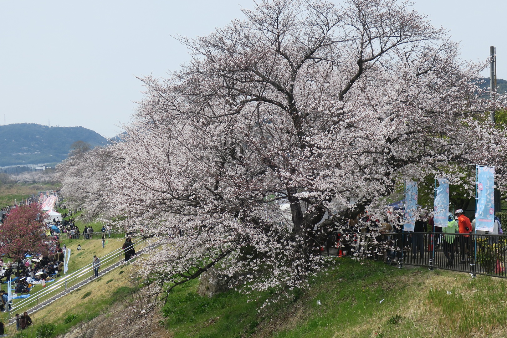 宇治川と木津川が合流して淀川になる地点に全長1.4kmにわたって2つの河川を区切るように設置された堤防が桜並木になっています。