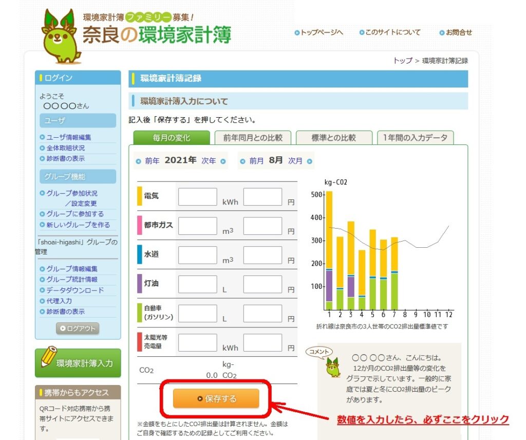 3.左側の「環境家計簿入力」ボタンをクリックする → 入力画面に切替わる