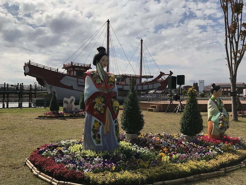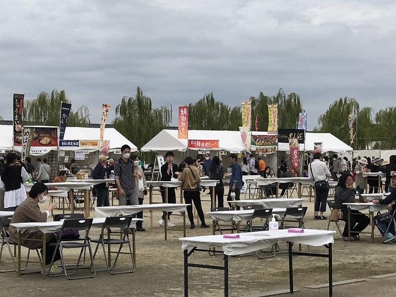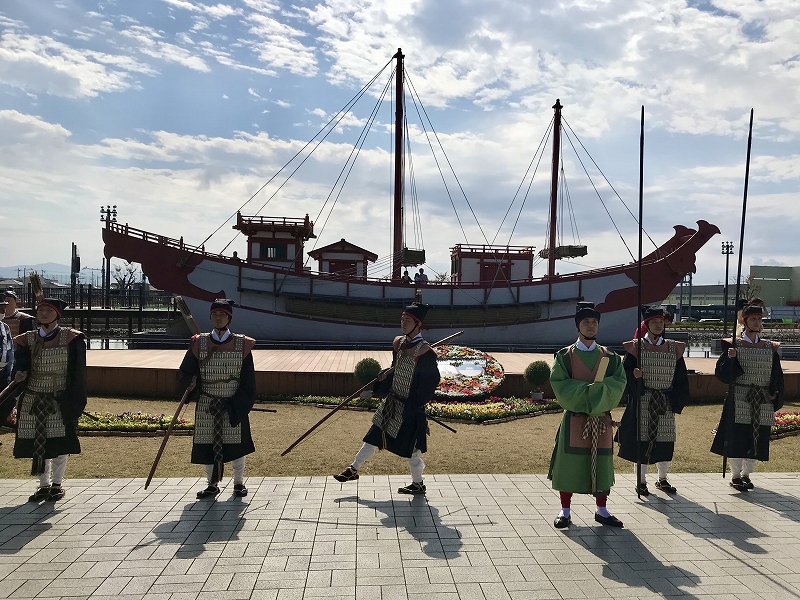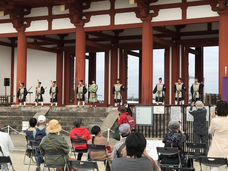 かつて都を警護していた衛士隊の行列、朱雀門ステージでの迫力ある和太鼓の演奏、遣唐使船前での花のフォトスポットなどを楽しみました。ひろばには沢山のお店が出店、感染症対策をしながら多くの来場者で賑わっていました。