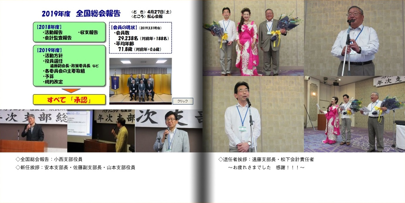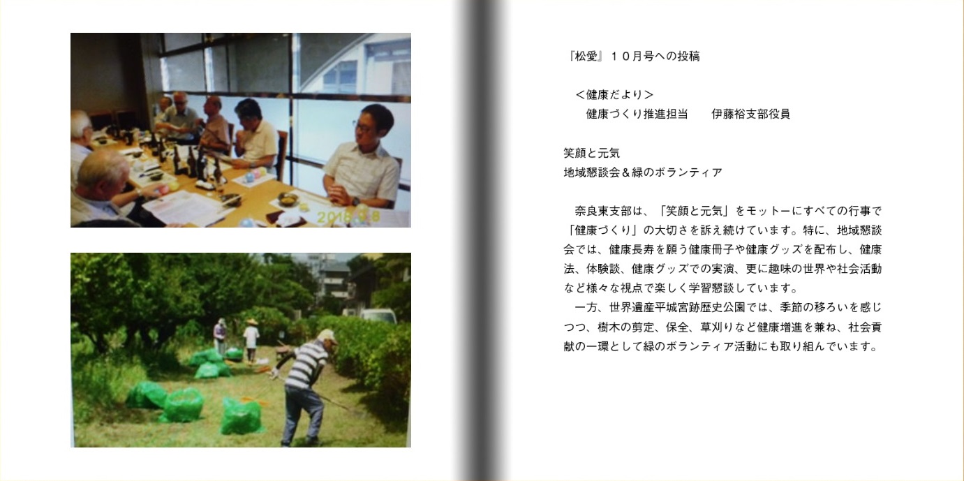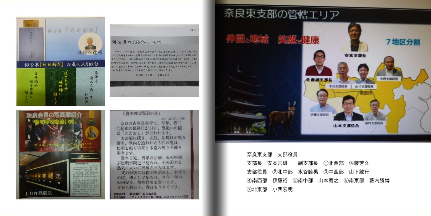 2020.04.26 本部掲載 奈良東支部 思い出アルバム(2019年度) 例年は年次支部総会にご出席された方や友愛訪問などでお渡ししておりましたが、本年度は年次支部総会が中止ですので、まずHPで昨年度の思い出をお届けしたいと思います。写真の上でクリック(⊕印)すると拡大して見ることができます。 綴じ代部分は黒くなっておりますが、是非ご覧ください。 現物のフォトブックをご希望の方は、担当の支部役員へお知らせください。 本部掲載 コメント: 0 庭の花たち(安本吉雄さん)前の記事 ★健康情報★パナソニック健康保険組合提供 2020.5…次の記事