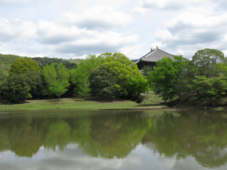 大仏殿の裏側に回ると、表側とは変わって、人はおらず、静寂が報館の西側に広がるヨシ原に日広がっています。