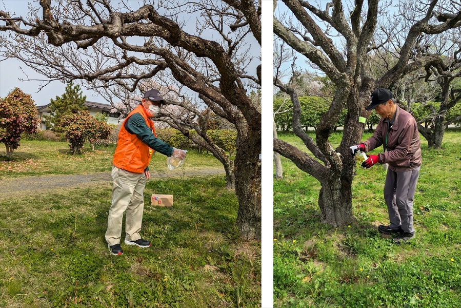 ・なお「ウメノキゴケの予防策」として数本の梅の木に試験的に木酢液を散布しました。今秋の効果チェックが楽しみです