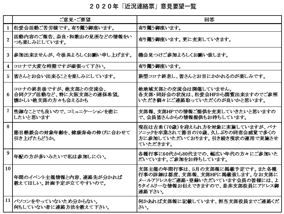 多くの会員の方から返信いただき有り難う御座いました。