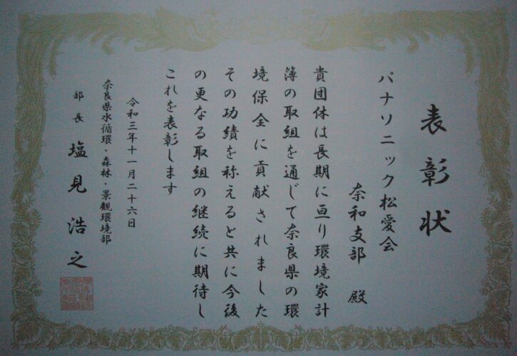 おかげさまで奈和支部の取組活動に対して奈良県から表彰状を頂きました(2021.11.26表彰式)。 - 奈良環境家計簿には2574世帯(奈和支部33世帯)が参加いただいております。