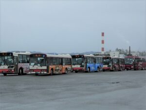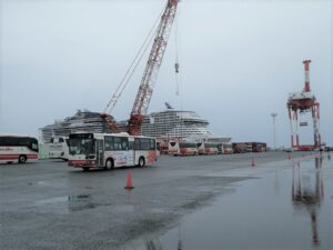 寄港地でお客様を観光ツアーに乗車する、バス、タクシーの行列は凄かったです。