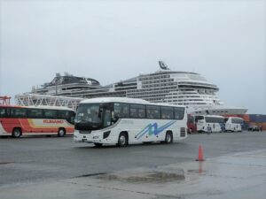 乗船客は寄港地ツアーや循環シャトルバス(港→和歌山城→紀三井寺→マリーナシティ黒潮市場)で和歌山を観光します。