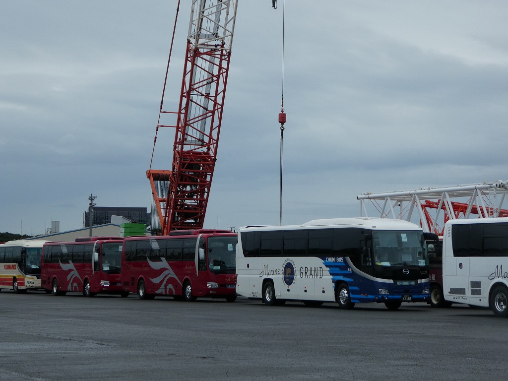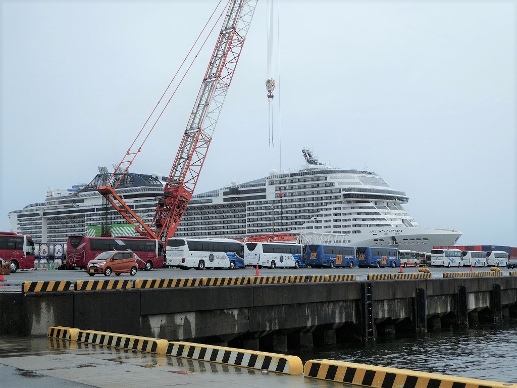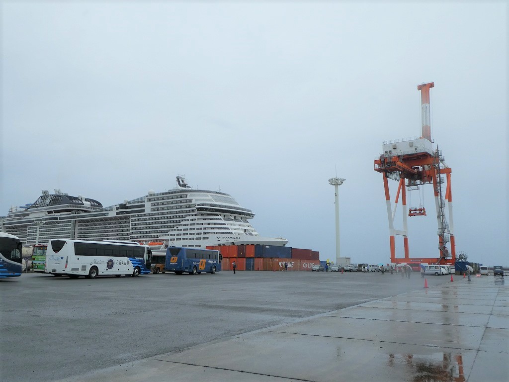 寄港地でお客様を観光ツアーに乗車する、バス、タクシーの行列は凄かったです。