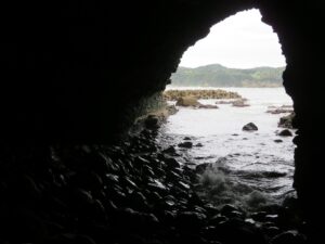 ・大池、中の池、奥の池の三部分からなり、池は溶岩塊の隙間を通して外海とつながっており、外海の干満に応じて池の水も増減します。