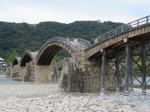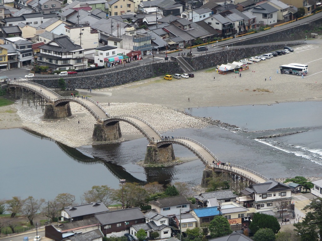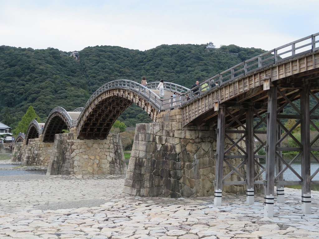 ・アーチが美しい五連の木造橋(名勝)、長さ193.3m、幅5mで木組みの技法で造られており、日本三名橋のひとつといわれています。