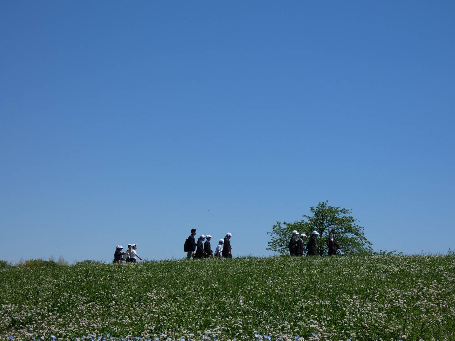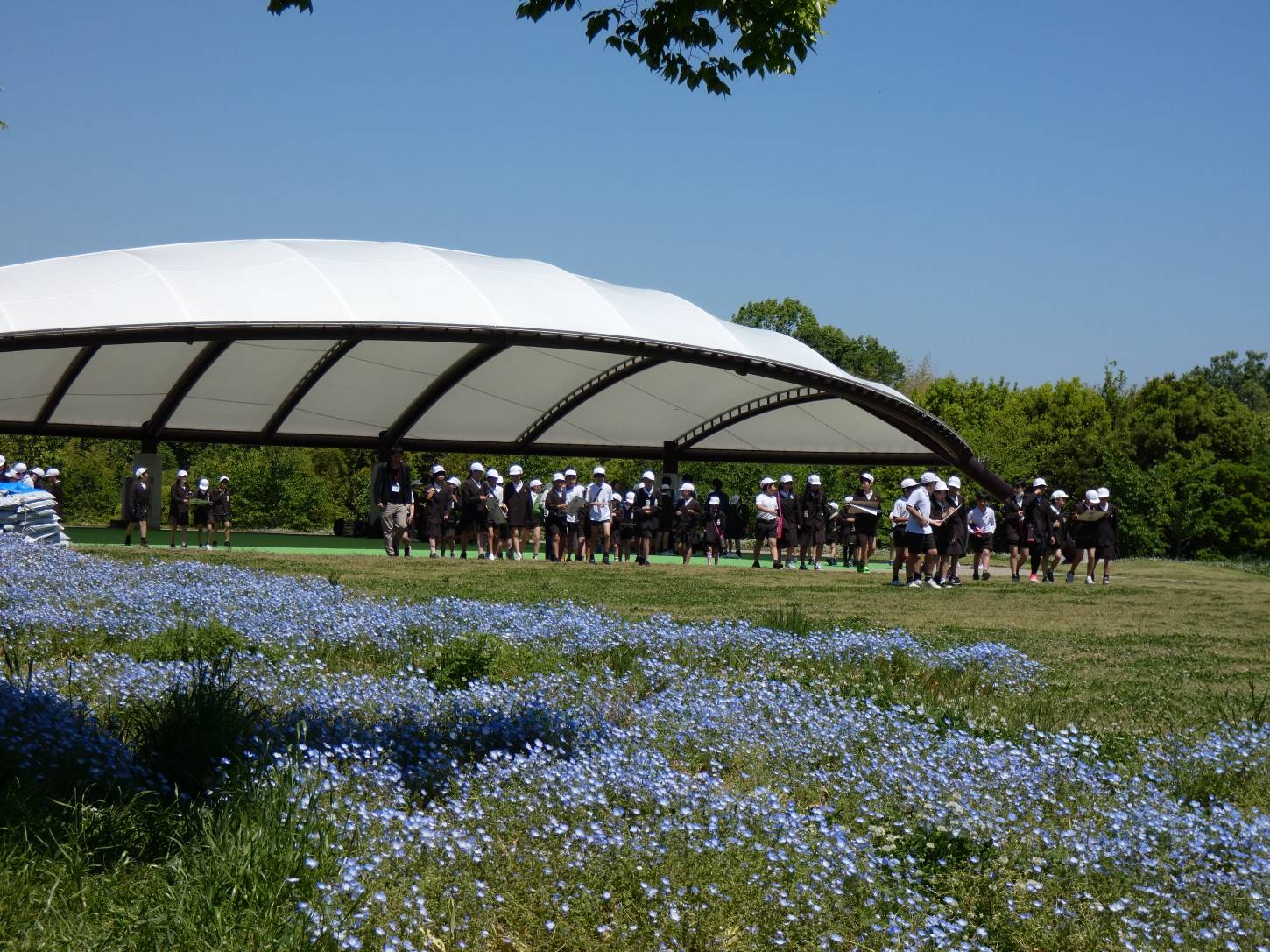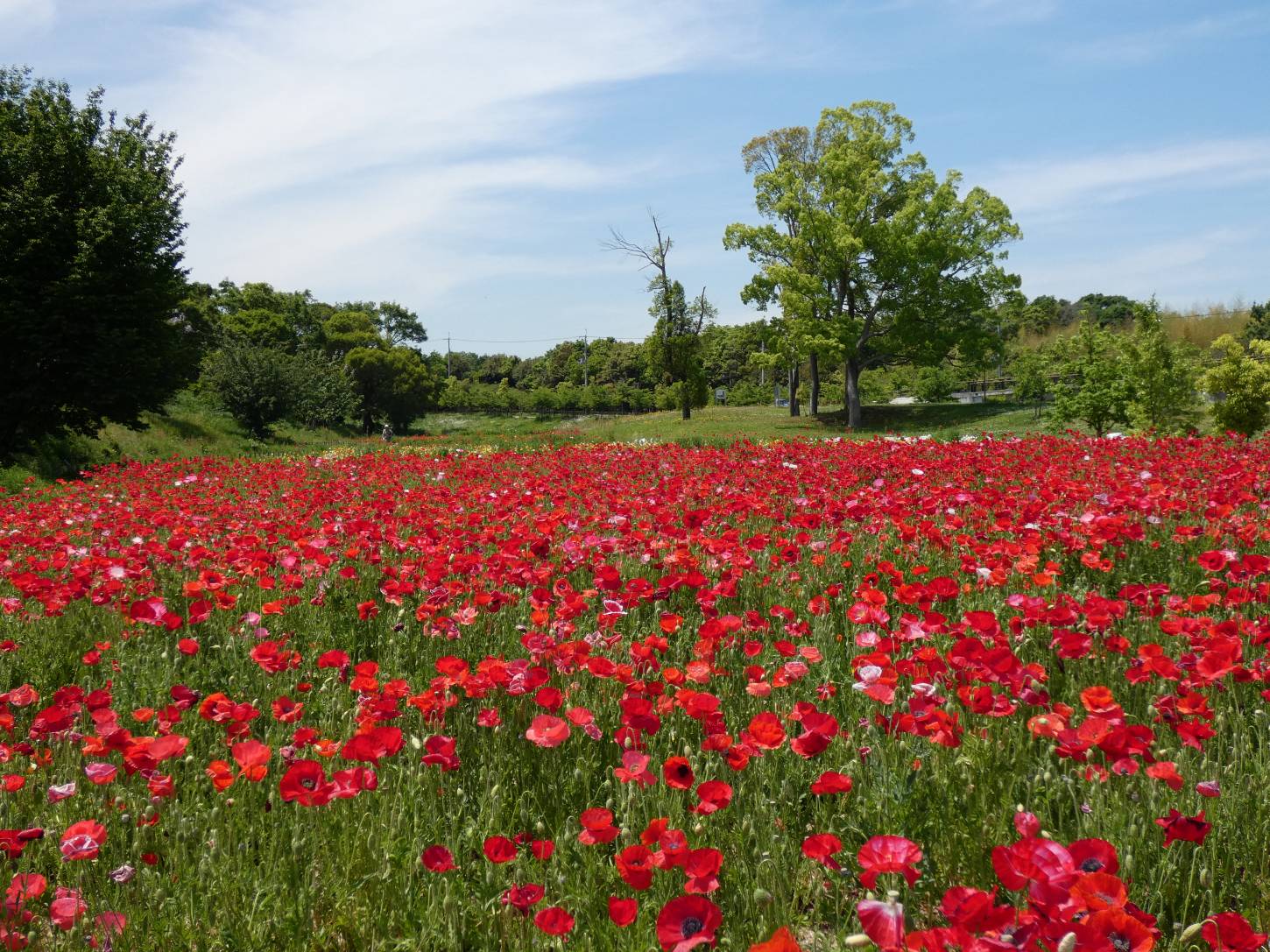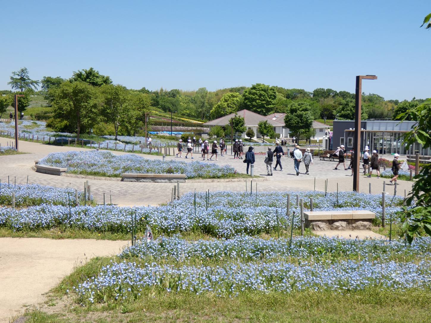 ネモフィラが青く咲き乱れ、バラ園も咲き出しました。南エリアではポピーがまるで赤い絨毯を敷き詰めたように咲いています。遠足や歩こう会などが訪れ、大賑わいです。