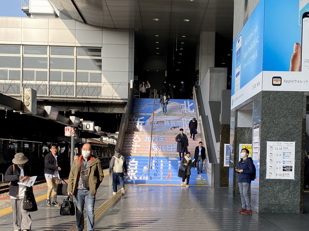 京都駅には階段に新幹線延伸の宣伝、サンダーバードで敦賀へ。乗客はほとんど金沢で下車でした。