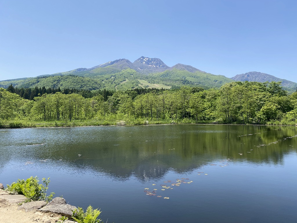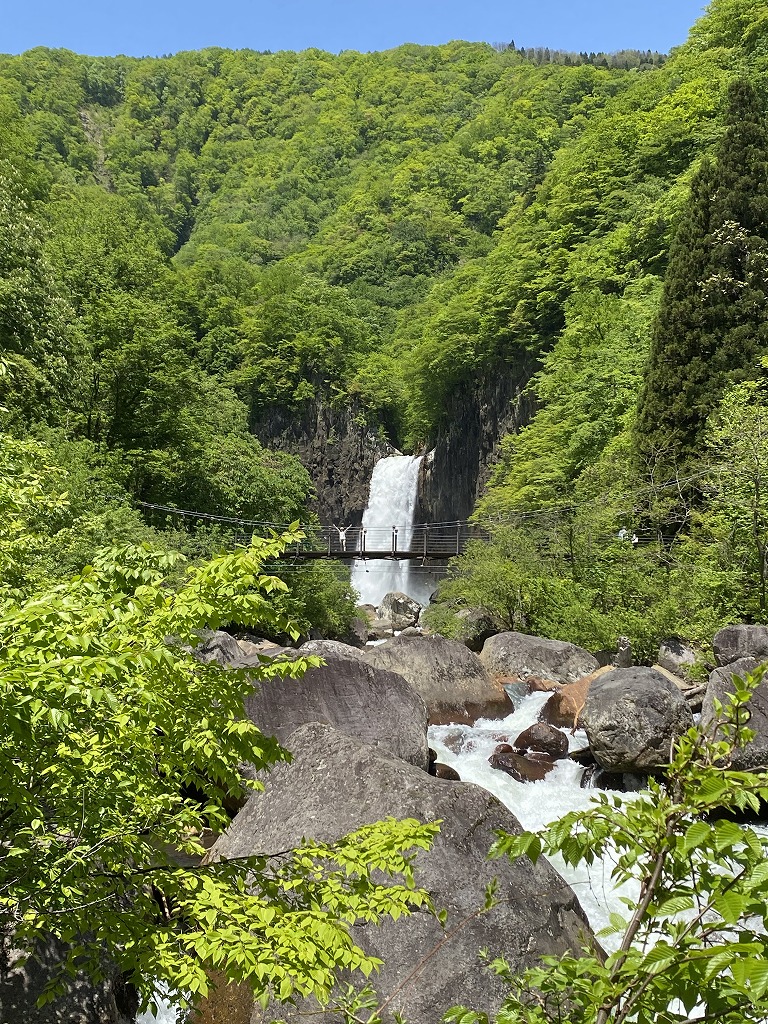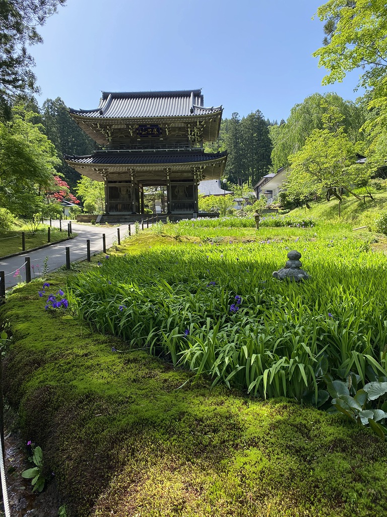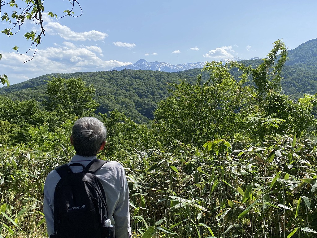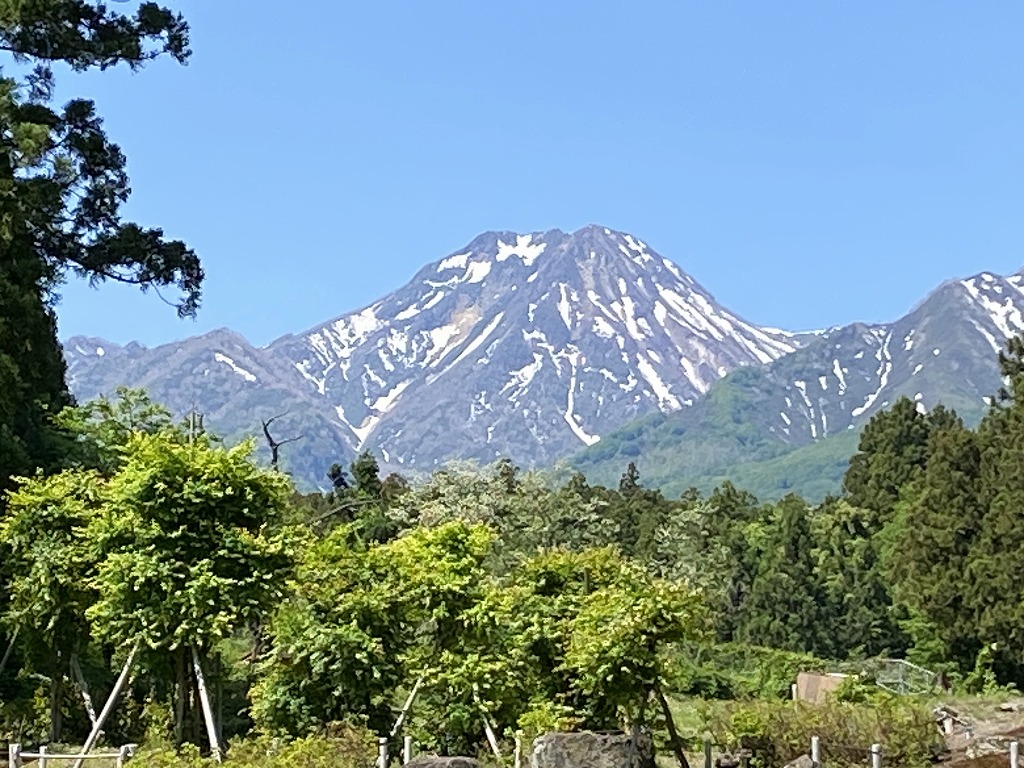 登山口の斐太歴史の里案内所で「旧関山宝蔵院庭園から妙高山の雪渓が山の字に見えるのは、あと数日、午前中が良い」と伺い翌朝に見に行きました。
