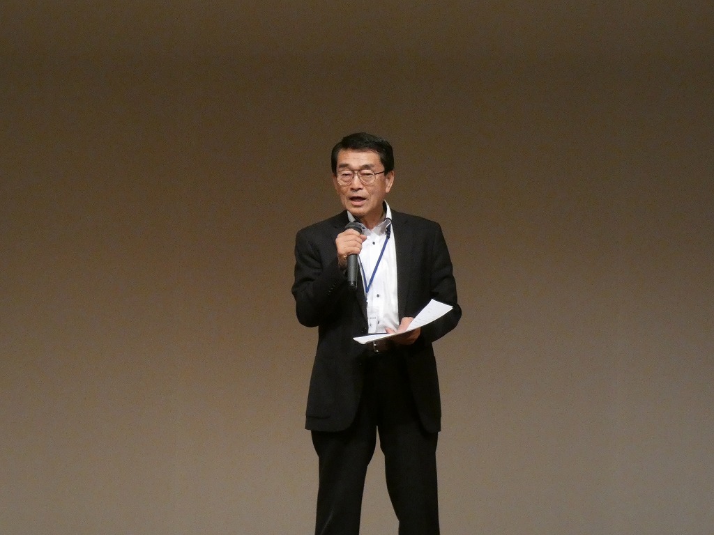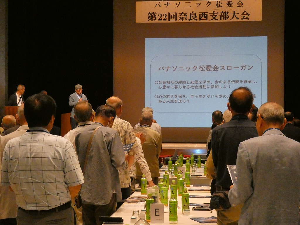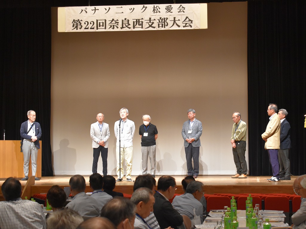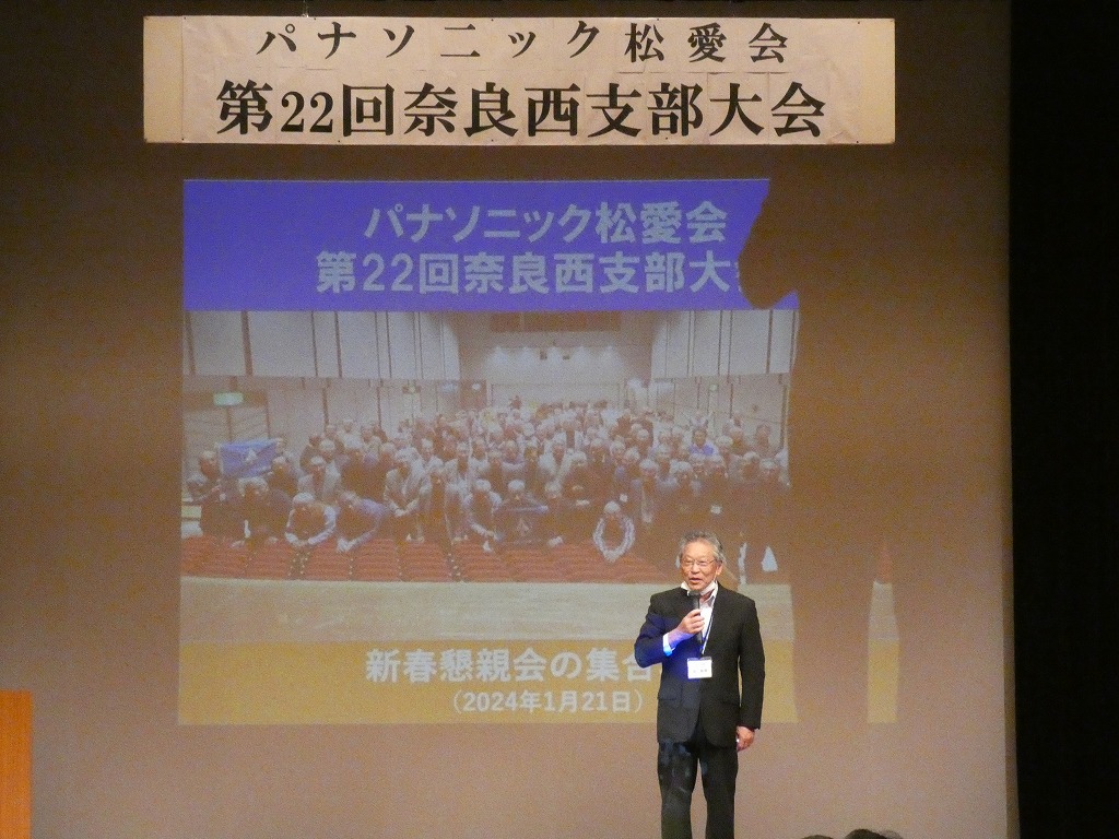 仁野役員の開会の辞に続き物故会員への黙祷を行いました。鷲山支部長の挨拶に続き松愛会の宮崎副会長から会長メッセージの披露と松愛会の現状報告などのお言葉をいただきました。次に、パナソニックホールディング株楠見CEOメッセージが披露代読されました。