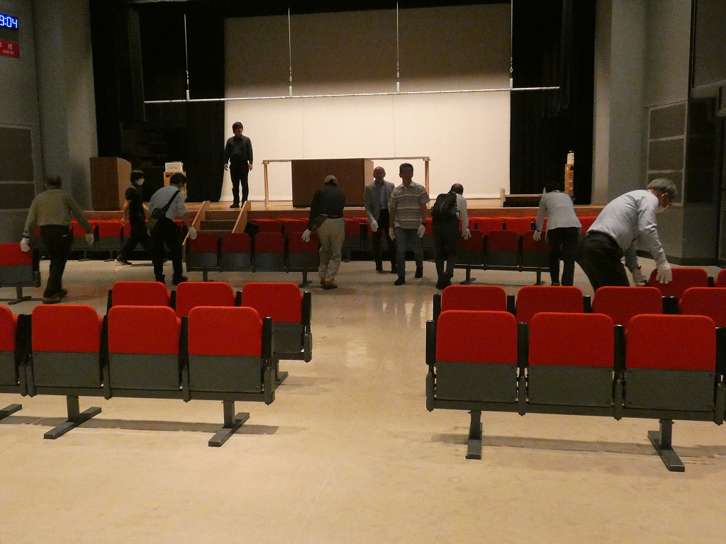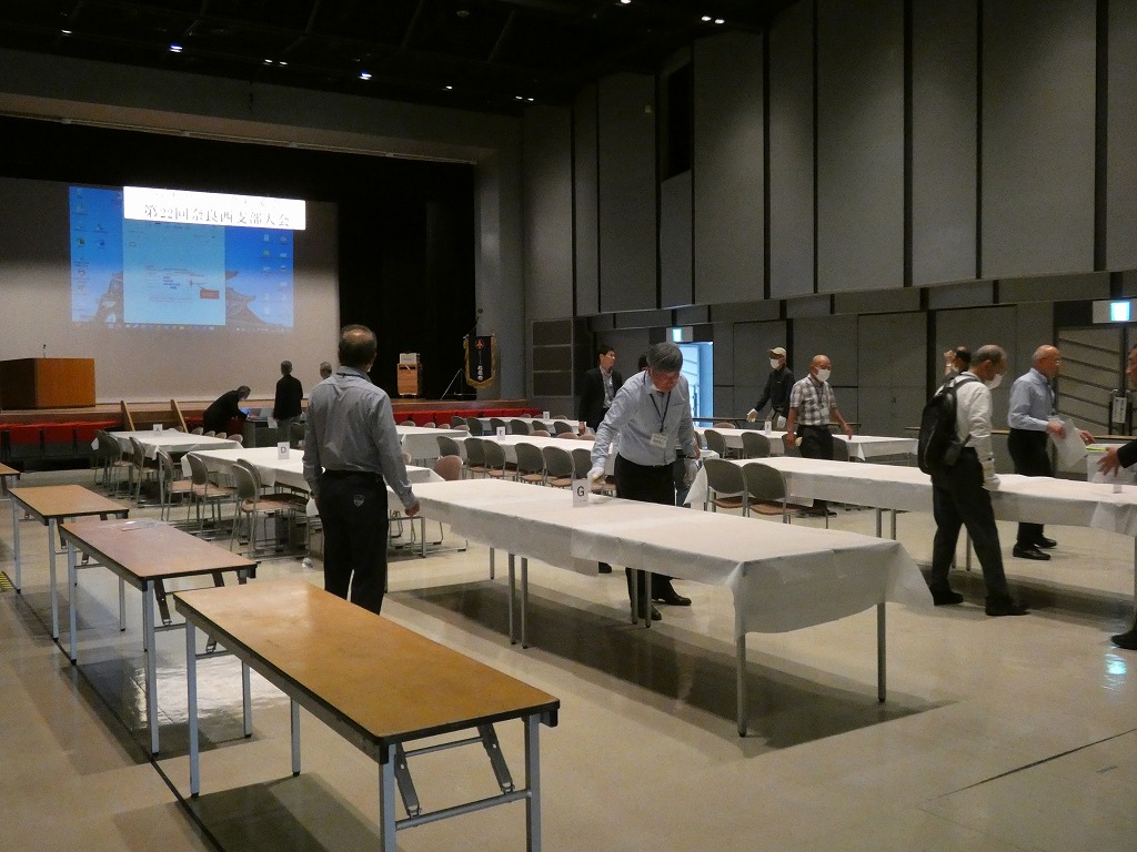 大会会場は生駒市コミュニティセンター、コロナ前に戻って会場設営は事前に応援をお願いした会員の皆さんと机や椅子を並べるところから始まりました。