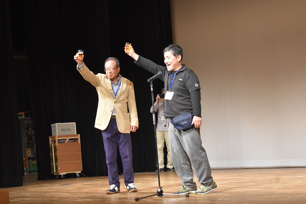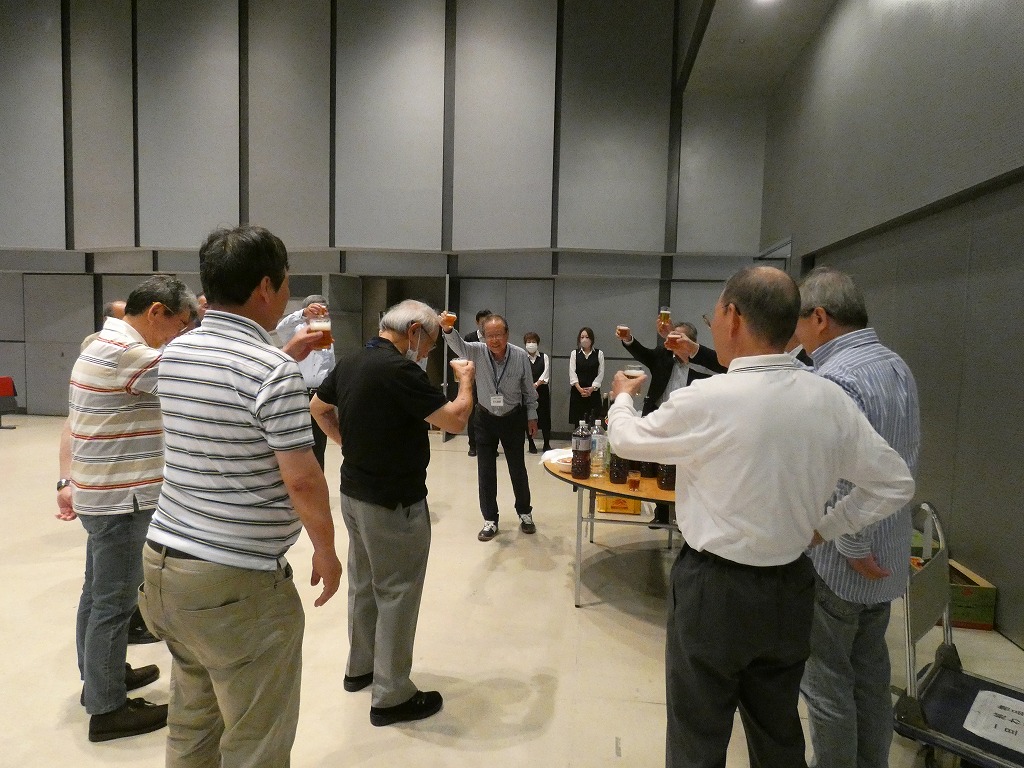 後片付け後は残りのお酒で乾杯。前回の新春懇親会ではお酒が残らずにお茶とお水で乾杯しましたが、今回はお酒が沢山残ってしまいました。残ったお酒は撤去作業で汗を流した皆様に持ち帰っていただく事になりました。次回は残らず飲み干して下さいね。