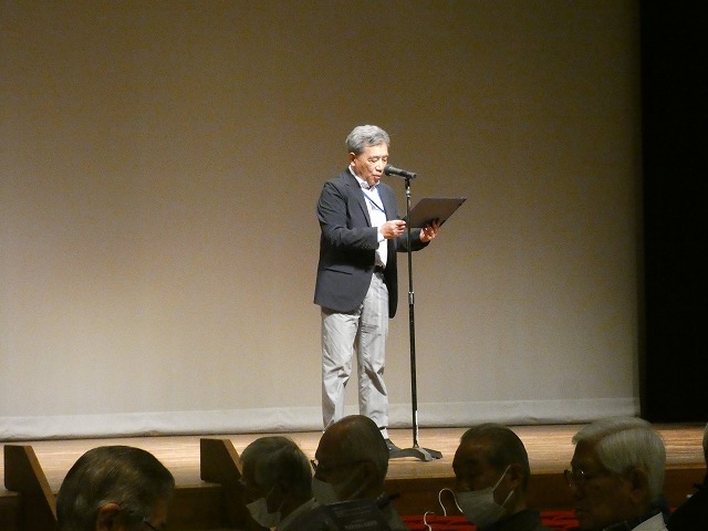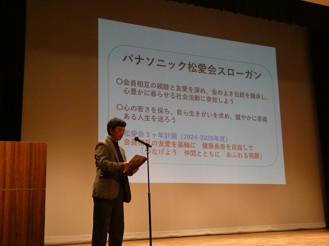 仁野役員の開会の辞に続き物故会員への黙祷を行いました。吉永支部長の挨拶に続き田中副支部長から松愛会松本会長からのメッセージの披露に続きパナソニックホールディング株楠見CEOメッセージが披露されました。
