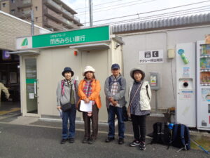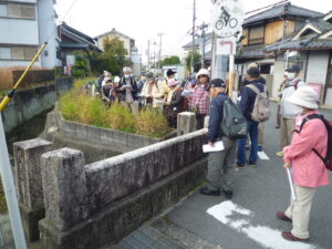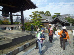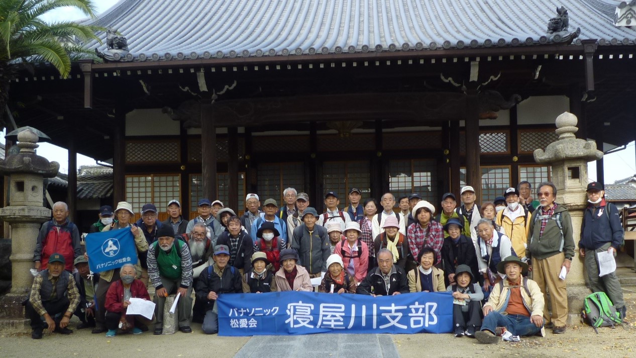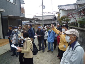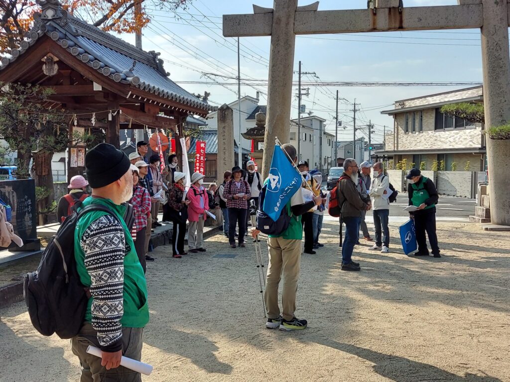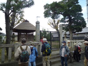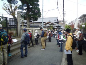 (出発)⇒丸山古墳⇒古代天野川地方條理区画五條通碑⇒明遍寺⇒白鳳時代長宝寺跡碑⇒郡津神社⇒私部城跡⇒ 私部の三大寺⇒無量光寺(集合写真)⇒住吉神社御旅所⇒北田家住宅⇒住吉神社⇒ 空禅藪(昼食) ⇒ 廃長福寺 ⇒ 教育文化会館 ⇒ 機物神社(集合写)⇒(解散)