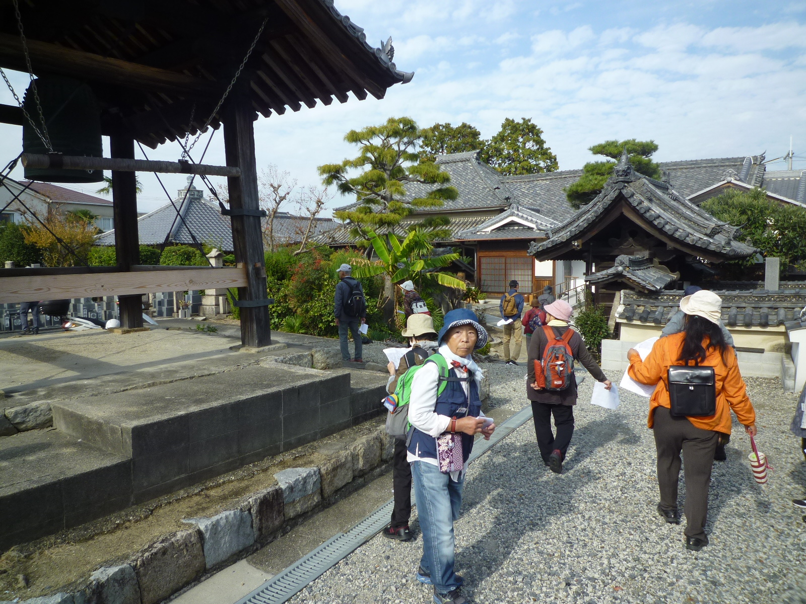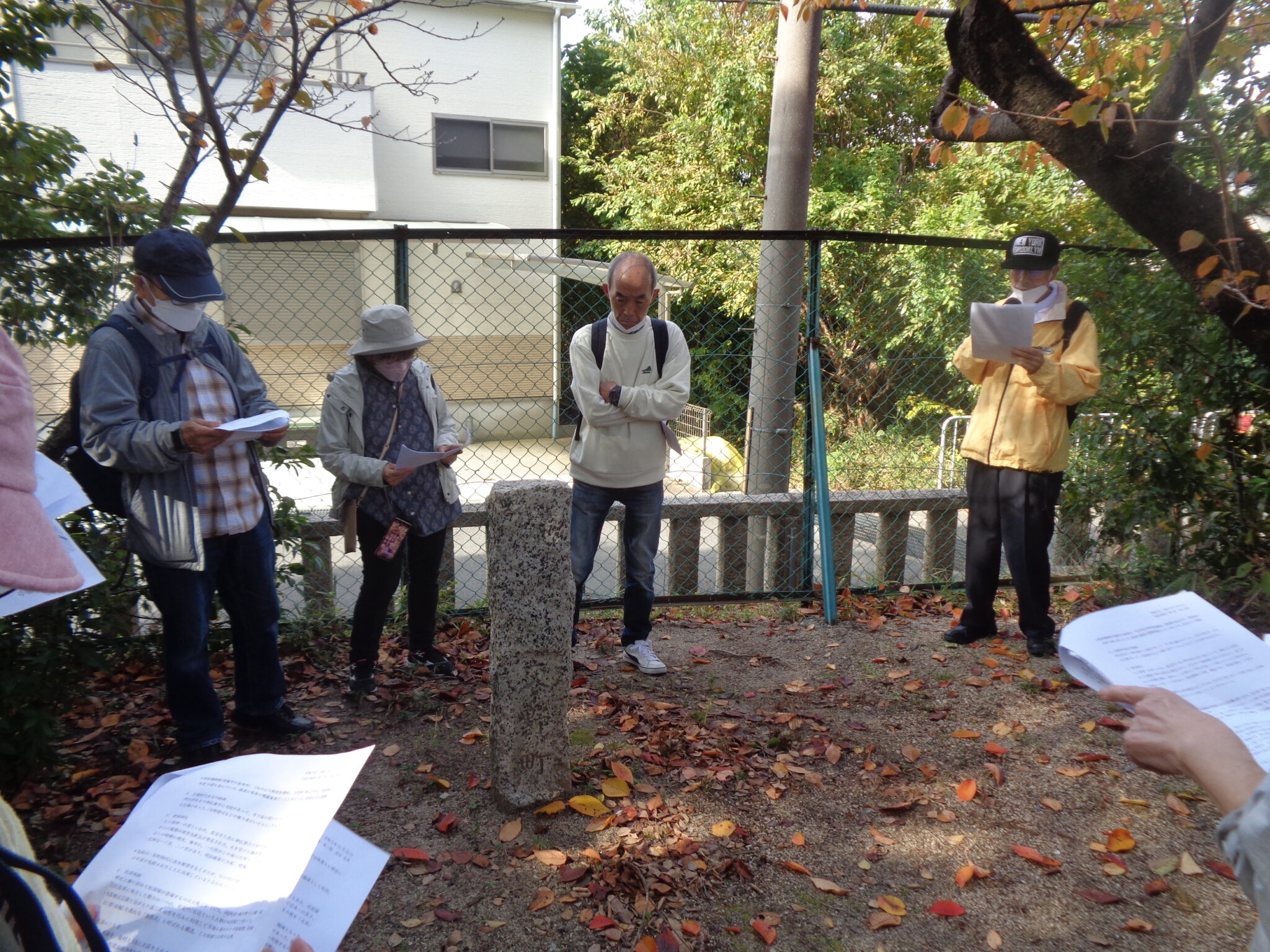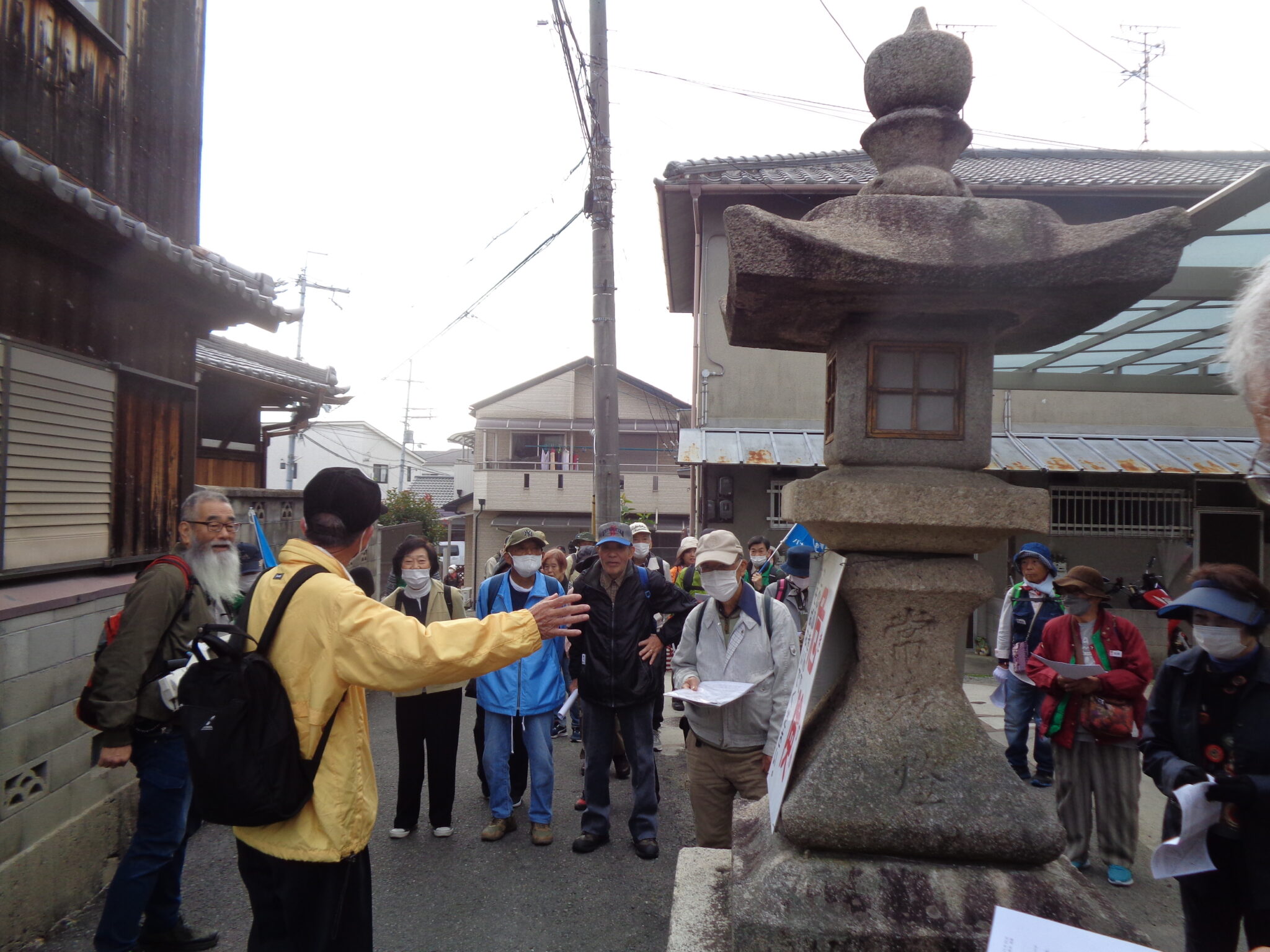 (出発)⇒丸山古墳⇒古代天野川地方條理区画五條通碑⇒明遍寺⇒白鳳時代長宝寺跡碑⇒郡津神社⇒私部城跡⇒ 私部の三大寺⇒無量光寺(集合写真)⇒住吉神社御旅所⇒北田家住宅⇒住吉神社⇒ 空禅藪(昼食) ⇒ 廃長福寺 ⇒ 教育文化会館 ⇒ 機物神社(集合写)⇒(解散)